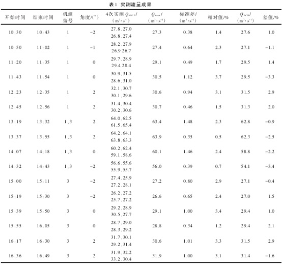 超聲波流量計(jì)安裝完成后,采用走航式ADCP進(jìn)行測流,被測機(jī)組為1號和3號機(jī)組,單機(jī).運(yùn)行、雙機(jī)運(yùn)行時(shí),葉片角度分別調(diào)整為-2°、0°、2°,實(shí)測流量成果見表1。