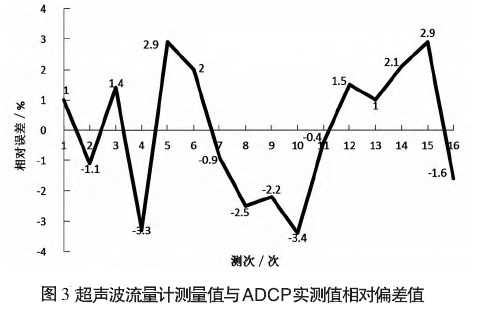 從表1可以看出,經(jīng)測量計(jì)算,超聲波流量計(jì)測量值與ADCP實(shí)測值相對偏差在-3.4%~2.9%,ADCP流量測驗(yàn)值最大偏差4.0%,ADCP實(shí)測流量相對標(biāo)準(zhǔn)差均在5%以內(nèi),符合流量測驗(yàn)規(guī)范要求,具體如圖3所示,比測與校驗(yàn)符合測驗(yàn)精度與相關(guān)技術(shù)指標(biāo)要求。